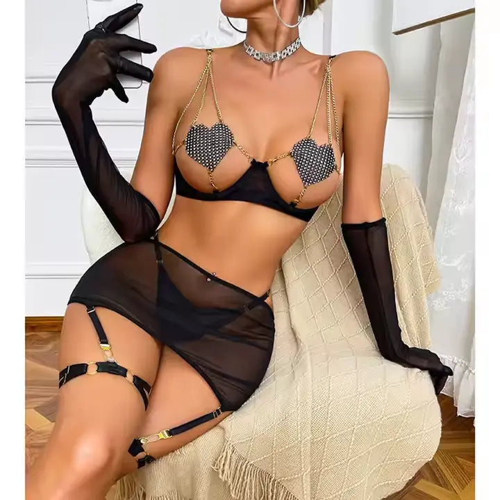 🔥 Conjunto de lencería sensual - transparente con cadena en forma de corazón y malla transparente 😳 - 🔥 Solo por hoy con envio gratis y un 30% de DCTO 🔥